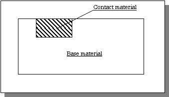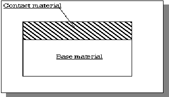 Typical configuration are as shown in below figure. These clad metals are furuished in remarkable long rolls with from 0.05mm to 3.0mm thickness and from 5.0mm to 100mm width. Since this materials have advantages of both contact efficiency of precious metal and mechanical property of base metal, moreover the volume of precious metal is reduced to the minimum required, these series of clad metals enable you to manufacture high quality of electric contacts at reduced cost. The selection of cladding metal is varied from gold, and gold alloys, for mocro-currency to silver cadmium oxide alloys for macro-currency. |